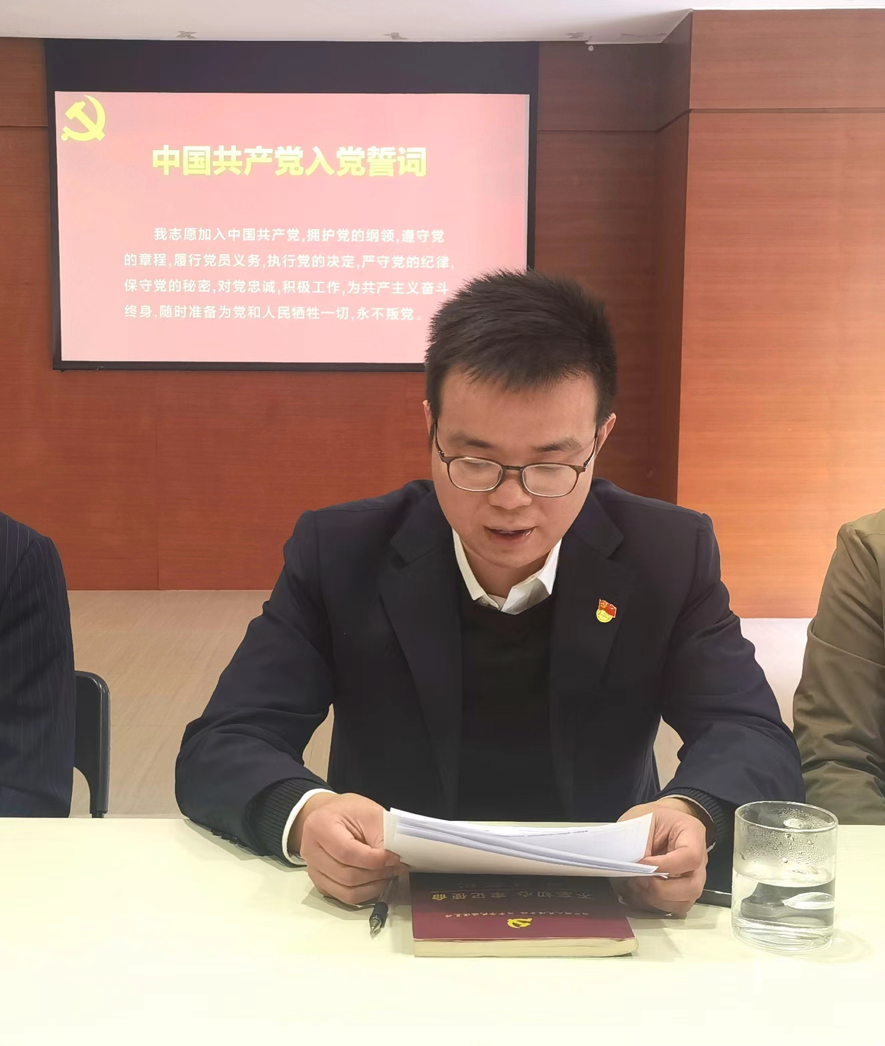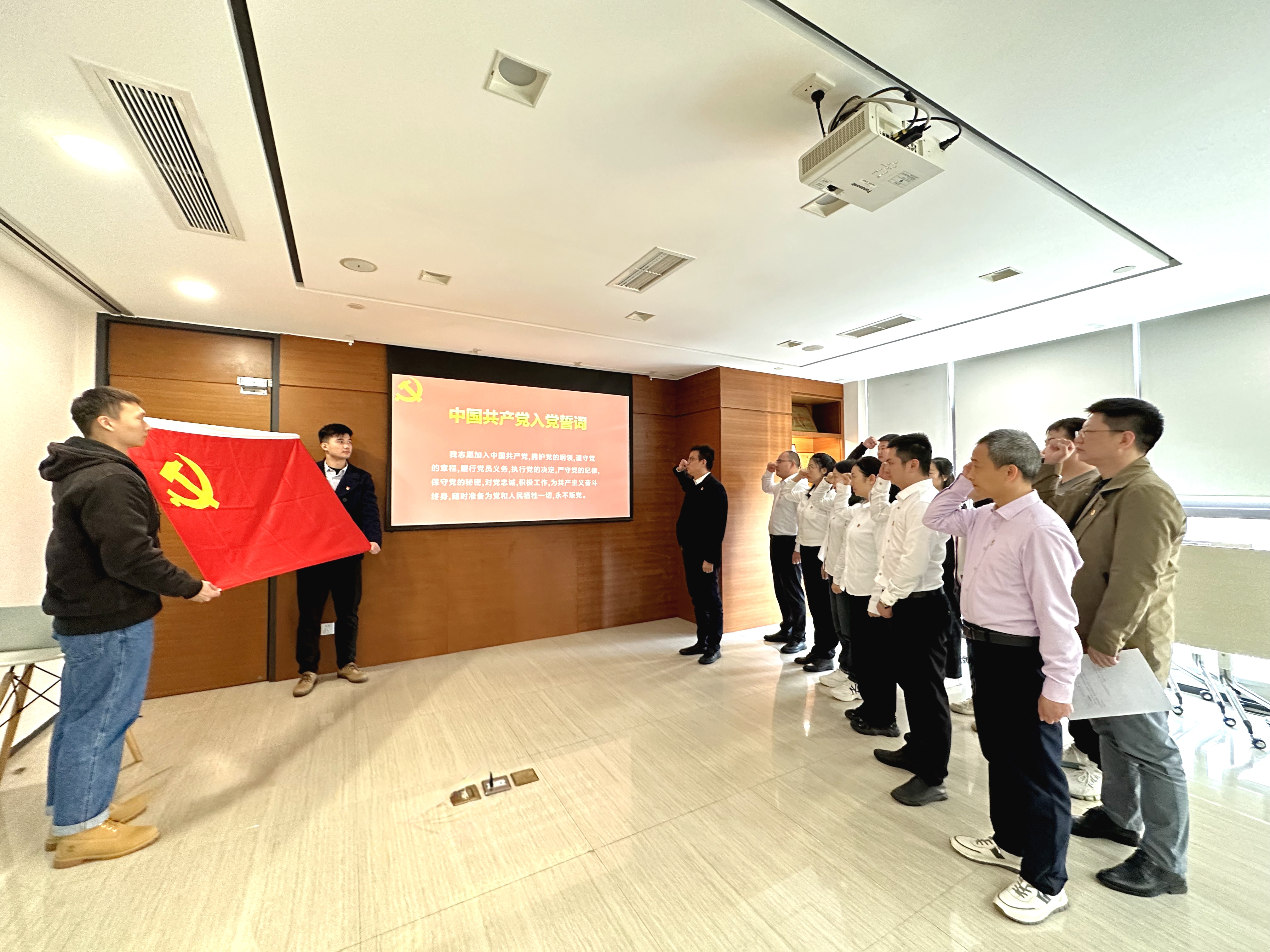 (新党员入党宣誓仪式) 宣誓仪式在激昂高亢的《国际歌》中拉开帷幕。5名新党员戴上党徽,在党支部副书记的带领下,面向党旗,右手举拳,庄严宣誓:“我志愿加入中国共产党,拥护党的纲领,遵守党的章程……”字字铿锵,句句千钧。 党支部副书记邱昂瑞对新党员表示祝贺,希望同志们终身牢记自己在党旗下所立的誓言,用实际行动践行自己的誓言,充分发挥共产党员先锋模范带头作用。新党员代表张舒表示将会把入党誓词作为自己终身的追求,不辜负党的期望,不辜负共产党员这个光荣的称号。