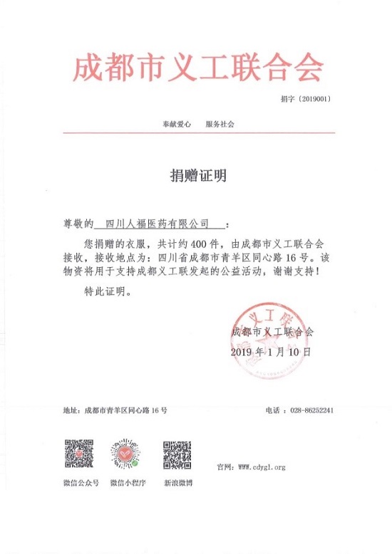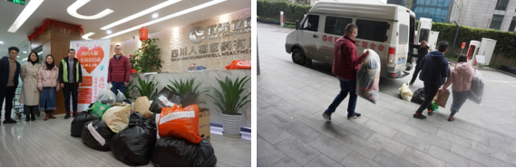 1月10号下午2:00,成都义工联合会的工作人员来到公司,对物资进行搬运,负责后续物资的送达工作,负责人彭大哥表示,人福公司的员工们真的很有爱心,他仅代表联合会和色达人民表示衷心的感谢!